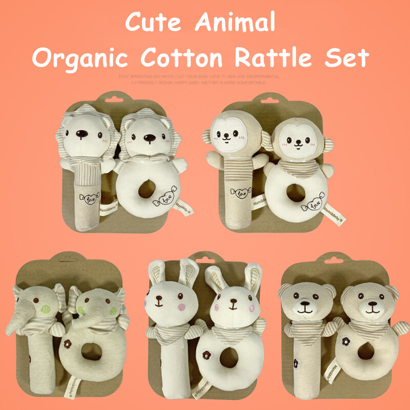 KiddoZone 2PCS婴儿摇铃儿童有机棉软挤压摇铃可爱动物安抚手摇铃毛绒手铃玩具BB声音0-3岁男孩女孩婴儿教育玩具